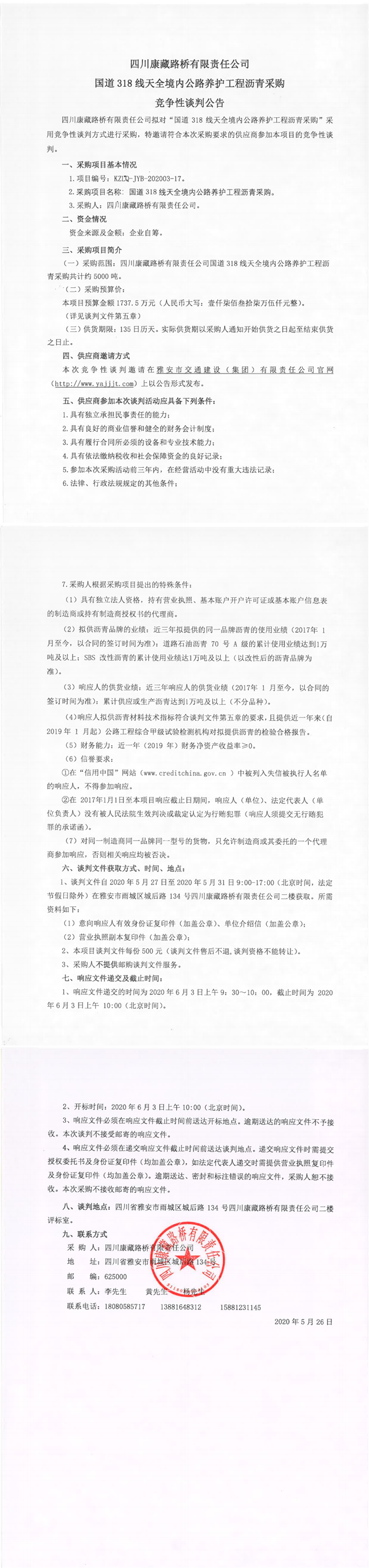四川康藏路橋有限責(zé)任公司國道318線天全境內(nèi)公路養(yǎng)護工程瀝青采購競爭性談判公告