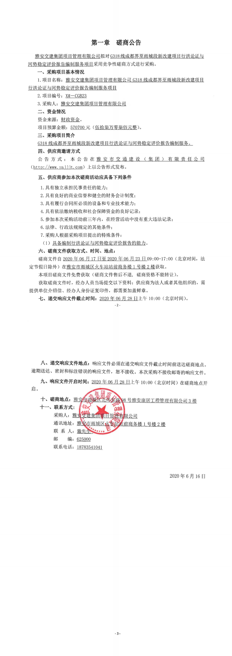 雅安交建集團(tuán)項(xiàng)目管理有限公司G318線成都界至雨城段新改建項(xiàng)目行洪論證與河勢(shì)穩(wěn)定評(píng)價(jià)報(bào)告編制服務(wù)項(xiàng)目競(jìng)爭(zhēng)性磋商公告