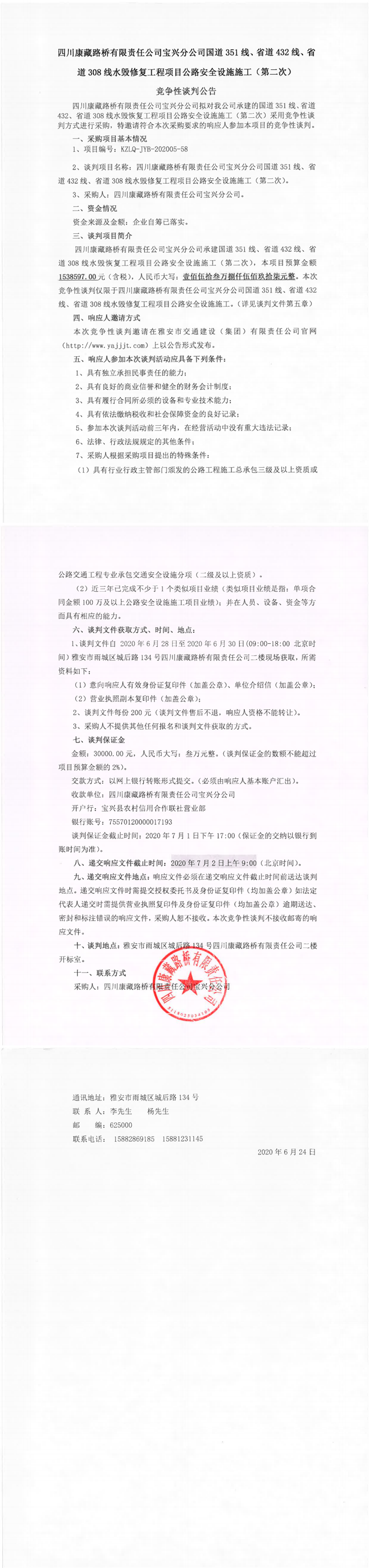四川康藏路橋有限責(zé)任公司寶興分公司國道351線、省道432線、省道308線水毀修復(fù)工程項目公路安全設(shè)施施工(第二次)競爭性談判公告
