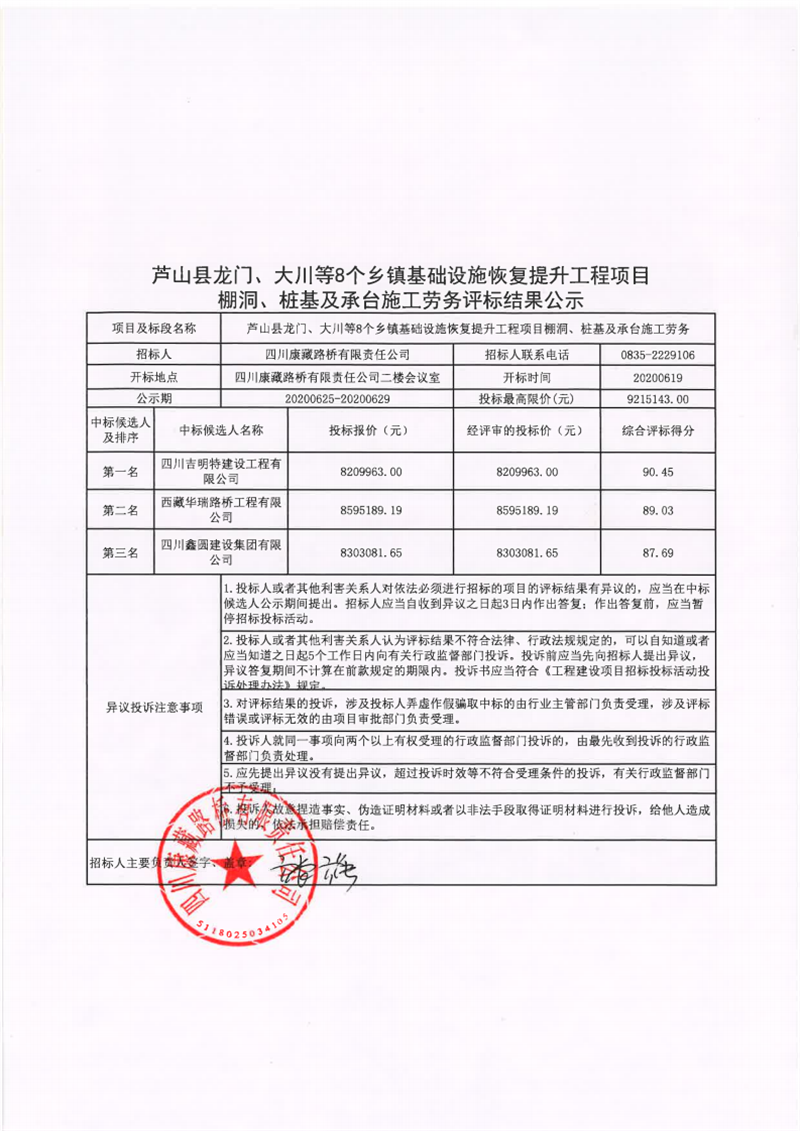 四川康藏路橋有限責任公司蘆山縣龍門、大川等8個鄉(xiāng)鎮(zhèn)基礎設施恢復提升工程項目棚洞、樁基及承臺施工勞務評標結果公示