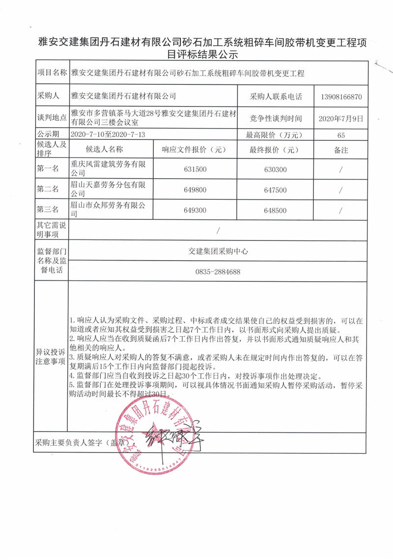 雅安交建集團丹石建材有限公司砂石加工系統(tǒng)粗碎車間膠帶機變更工程項目評標結(jié)果公示