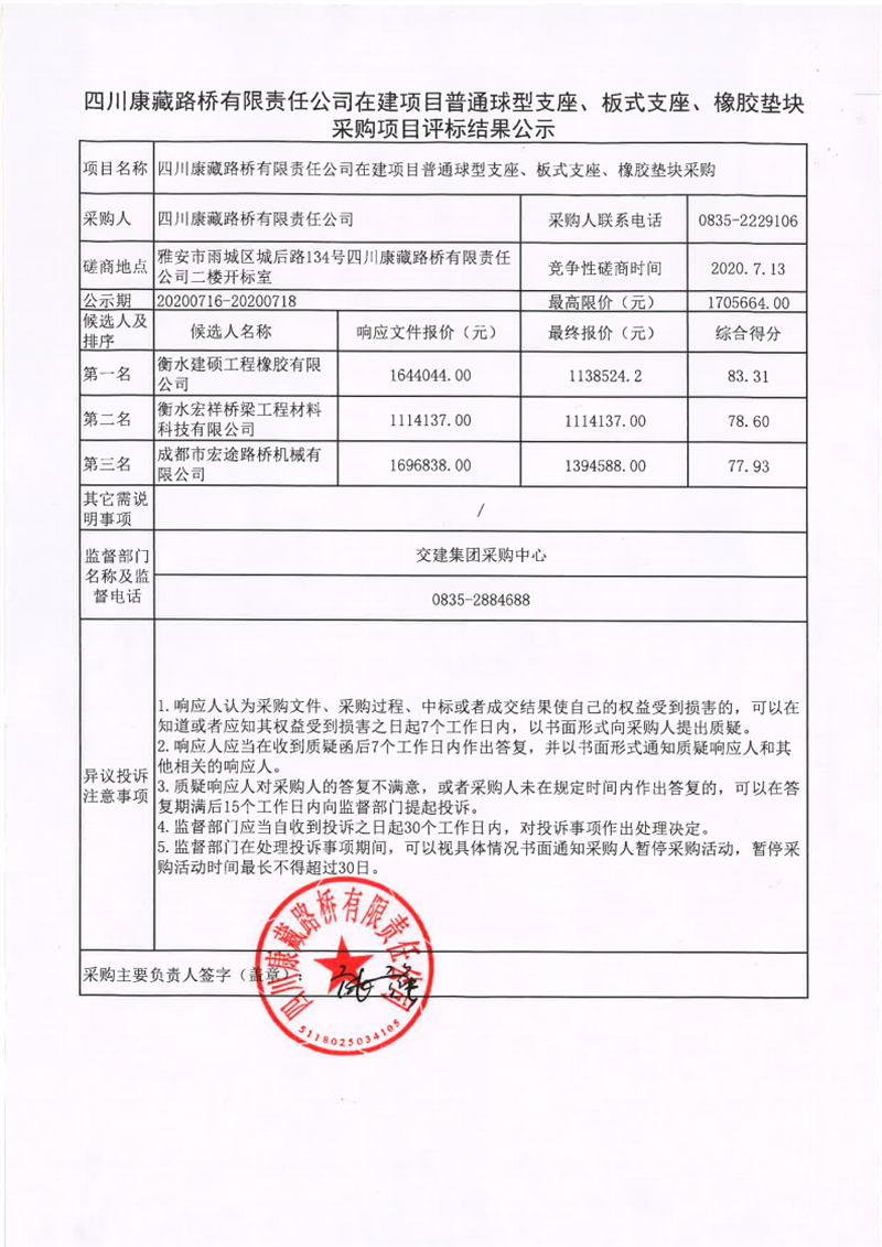 四川康藏路橋有限責(zé)任公司在建項(xiàng)目普通球型支座、板式支座、橡膠墊塊采購(gòu)項(xiàng)目評(píng)標(biāo)結(jié)果公示