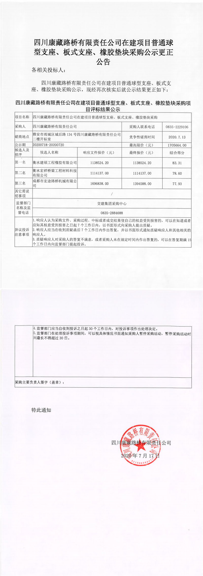 四川康藏路橋有限責(zé)任公司在建項(xiàng)目普通球型支座、板式支座、橡膠墊塊采購(gòu)公示更正公告