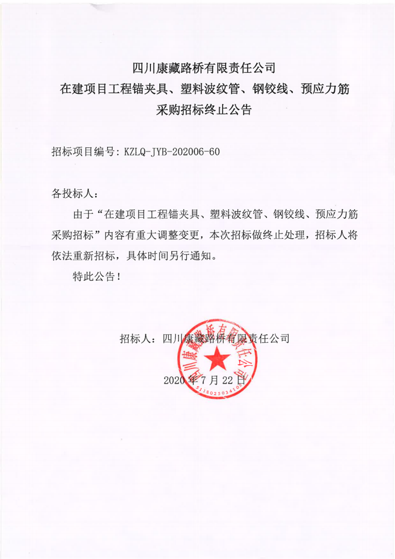 四川康藏路橋有限責(zé)任公司在建項目工程錨夾具、塑料波紋管、鋼鉸線、預(yù)應(yīng)力筋采購招標(biāo)終止公告