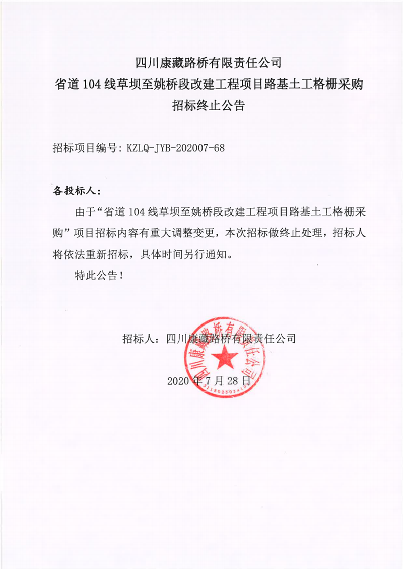 四川康藏路橋有限公司省道104線草壩至姚橋段改建工程項目路基土工格柵采購招標(biāo)終止公告
