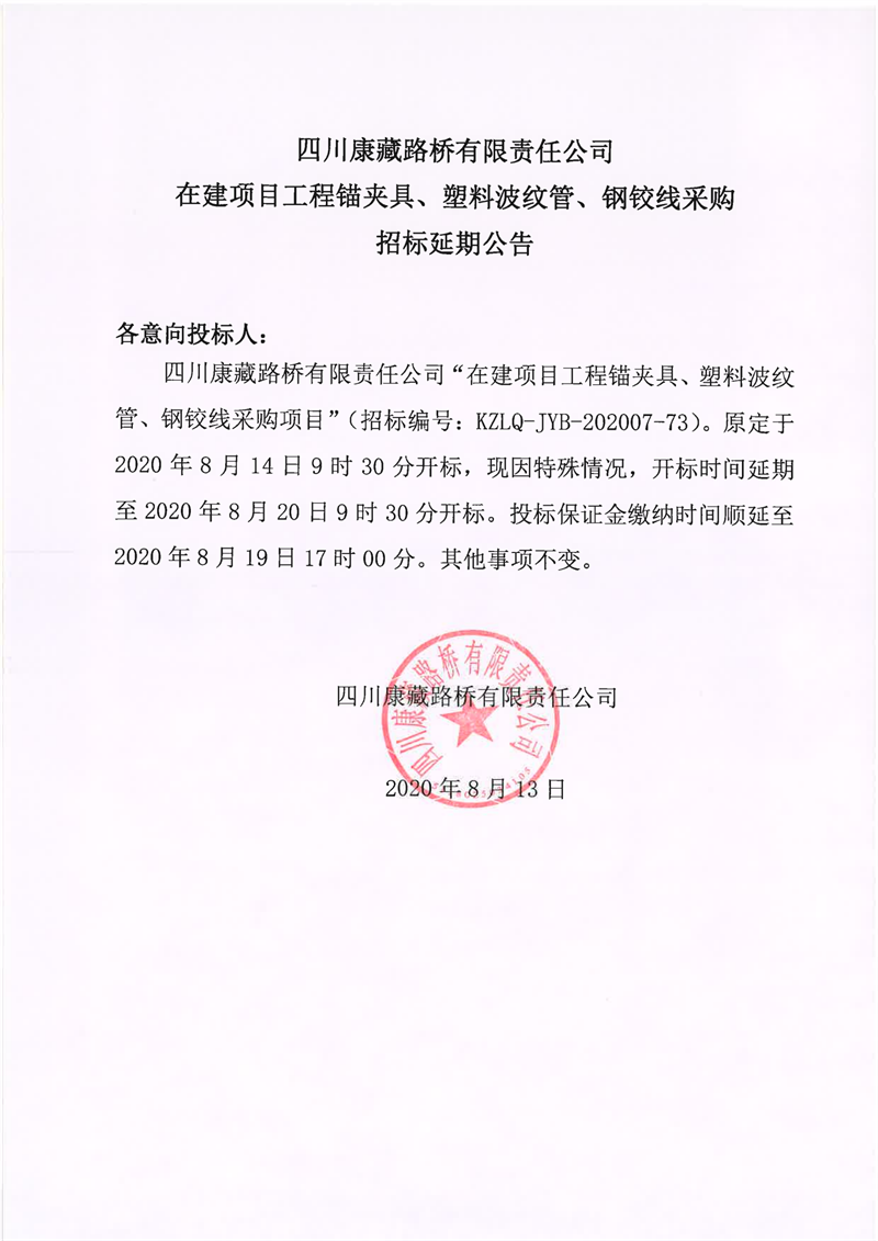 四川康藏路橋有限責(zé)任公司在建項(xiàng)目工程錨夾具、塑料波紋管、鋼鉸線采購(gòu)招標(biāo)延期公告