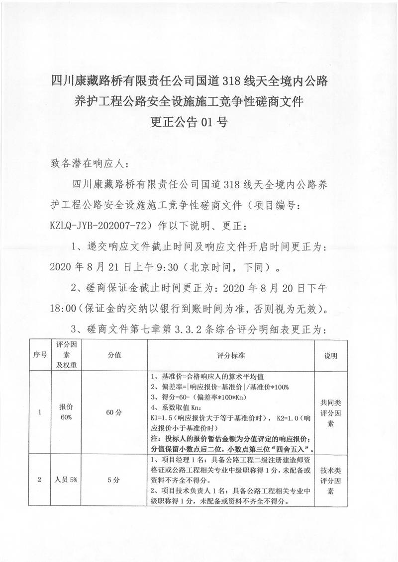 四川康藏路橋有限責(zé)任公司國(guó)道318線天全境內(nèi)公路養(yǎng)護(hù)工程公路安全設(shè)施施工競(jìng)爭(zhēng)性磋商文件更正公告01號(hào)