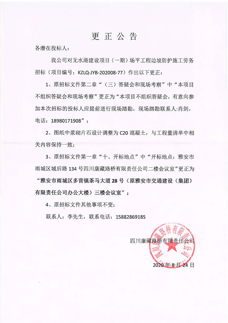 四川康藏路橋有限責(zé)任公司無水港建設(shè)項(xiàng)目(一期)場(chǎng)平工程邊坡防護(hù)施工勞務(wù)招標(biāo)更正公告