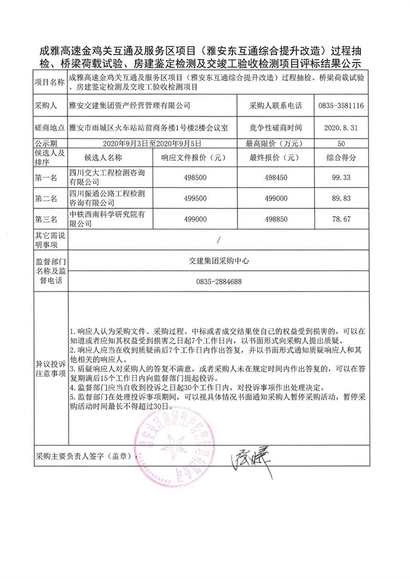 雅安交建集團資產(chǎn)經(jīng)營管理有限公司成雅高速金雞關互通及服務區(qū)項目(雅安東互通綜合提升改造)過程抽檢、橋梁荷載試驗、房建鑒定檢測及交竣工驗收檢測項目評標結(jié)果公示