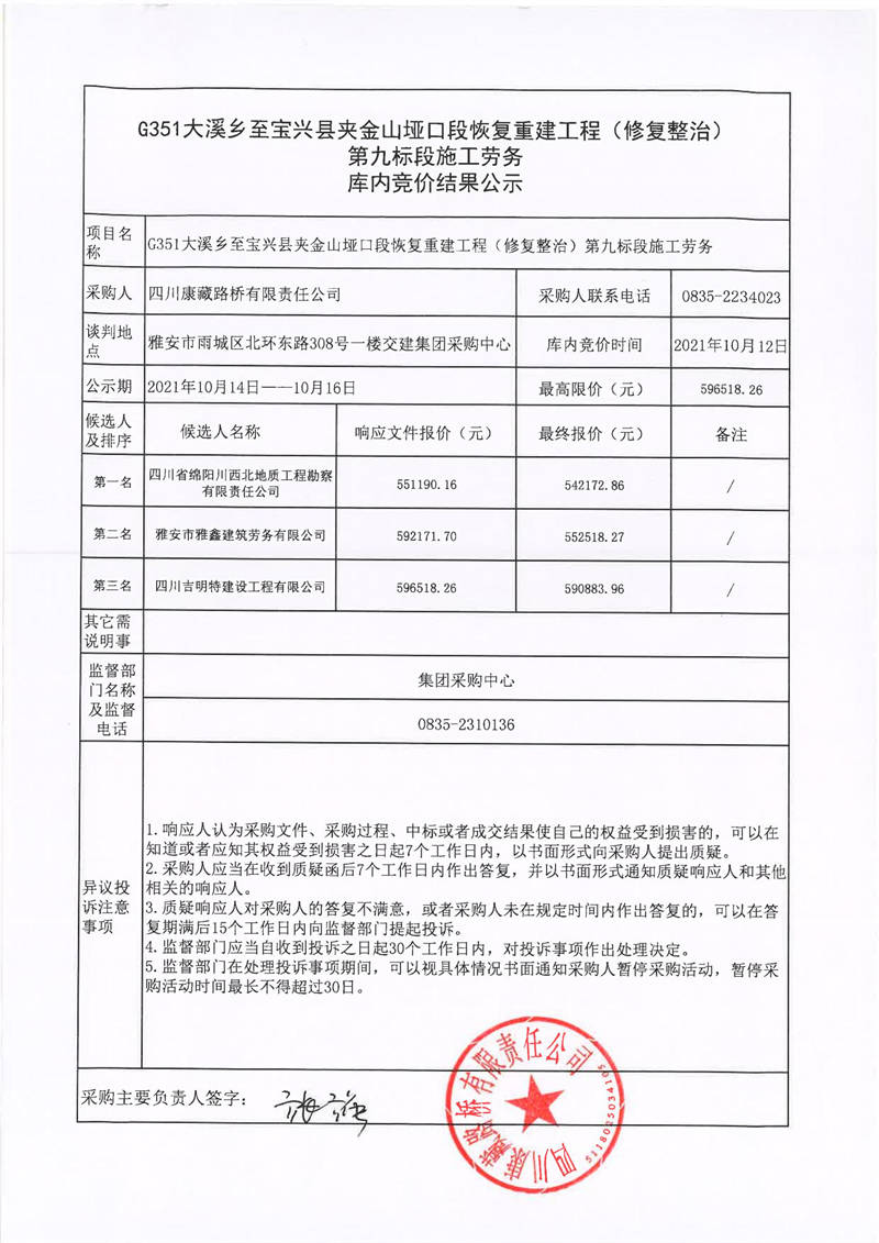 四川康藏路橋有限責(zé)任公司G351大溪鄉(xiāng)至寶興縣夾金山埡口段恢復(fù)重建工程(修復(fù)整治)第九標(biāo)段施工勞務(wù)庫內(nèi)競價(jià)結(jié)果公示