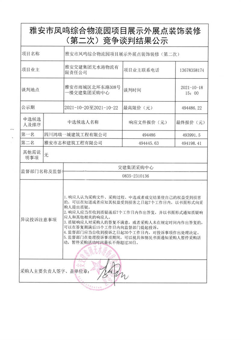 雅安交建集團(tuán)無水港物流有限責(zé)任公司雅安市鳳鳴綜合物流園項(xiàng)目展示外展點(diǎn)裝飾裝修(第二次)競爭談判結(jié)果公示