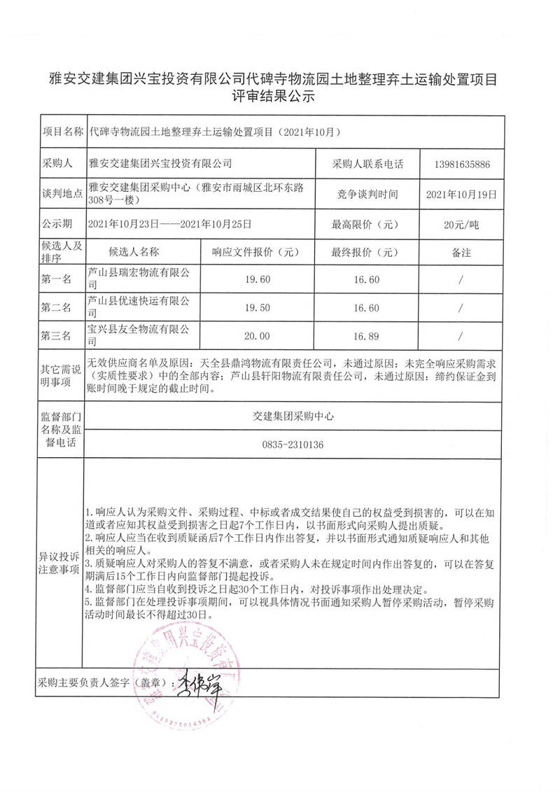 雅安交建集團(tuán)興寶投資有限公司代碑寺物流園土地整理?xiàng)壨吝\(yùn)輸處置項(xiàng)目評審結(jié)果公示