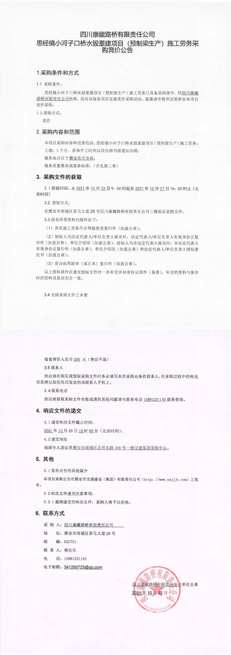 四川康藏路橋有限責任公司思經(jīng)鎮(zhèn)小河子口橋水毀重建項目(預制梁生產(chǎn))施工勞務采購競價公告