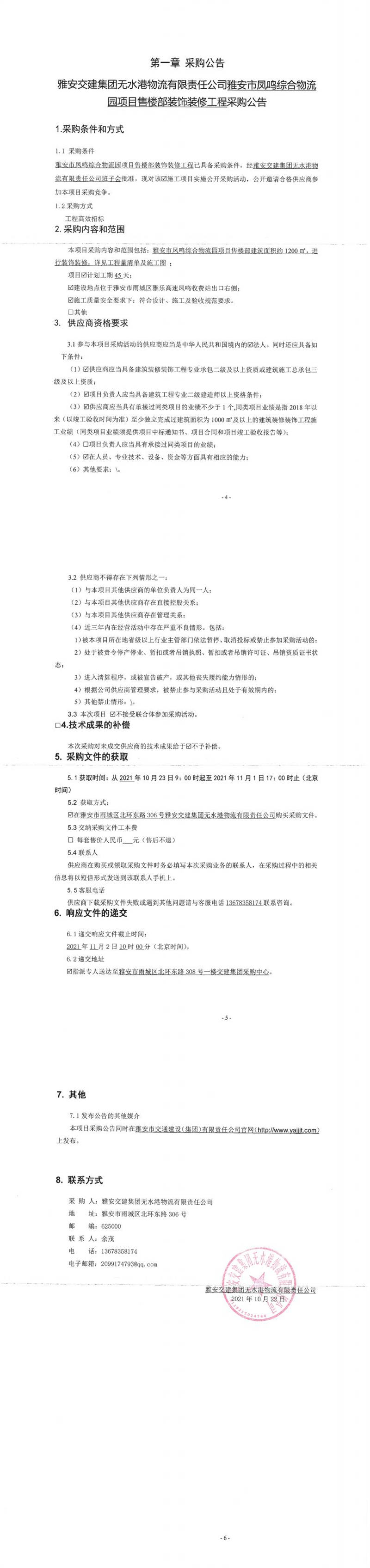 雅安交建集團無水港物流有限責(zé)任公司雅安市鳳鳴綜合物流園項目售樓部裝飾裝修工程(第二次)采購公告