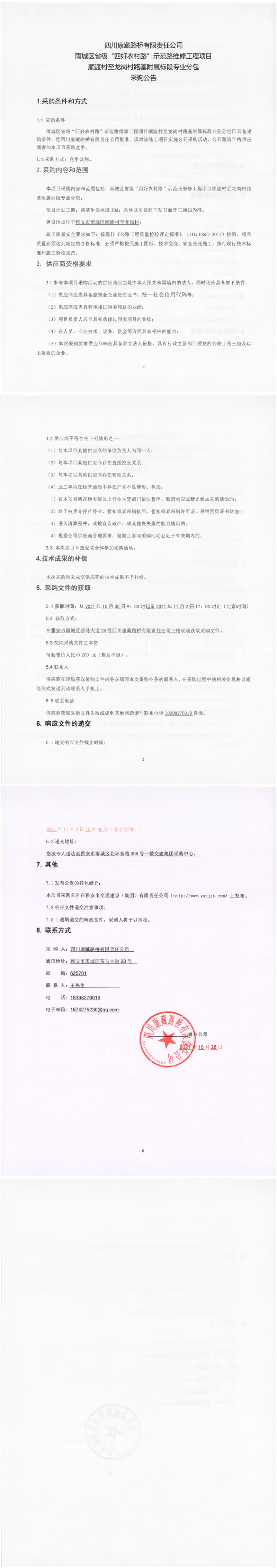 四川康藏路橋有限責(zé)任公司雨城區(qū)省級“四好農(nóng)村路”示范路維修工程項目順渡村至龍崗村路基附屬標段專業(yè)分包采購公告