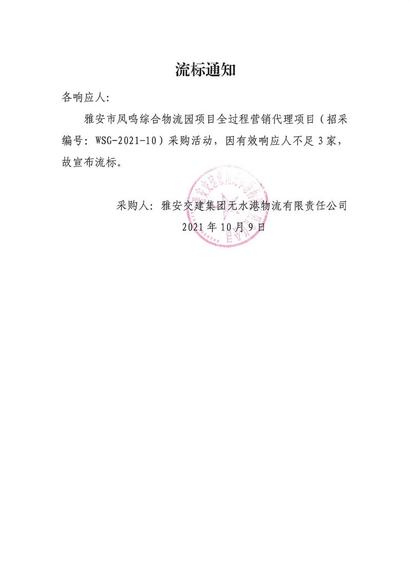 雅安交建集團無水港物流有限責(zé)任公司雅安市鳳鳴綜合物流園項目全過程營銷代理項目流標(biāo)通知