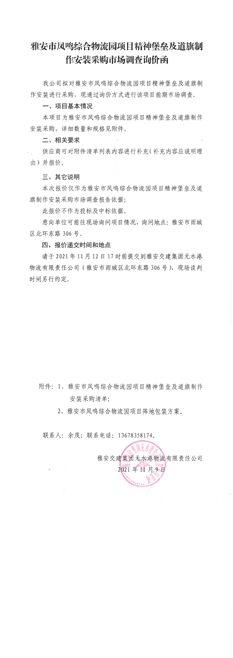 雅安交建集團(tuán)無(wú)水港物流有限責(zé)任公司雅安市鳳鳴綜合物流園項(xiàng)目精神堡壘及道旗制作安裝采購(gòu)市場(chǎng)調(diào)查詢(xún)價(jià)函