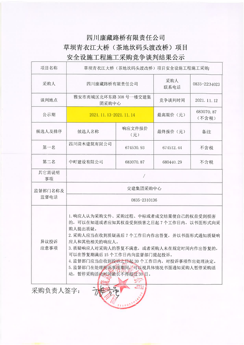 四川康藏路橋有限責(zé)任公司草壩青衣江大橋(茶地坎碼頭渡改橋)項(xiàng)目安全設(shè)施施工采購競爭談判結(jié)果公示