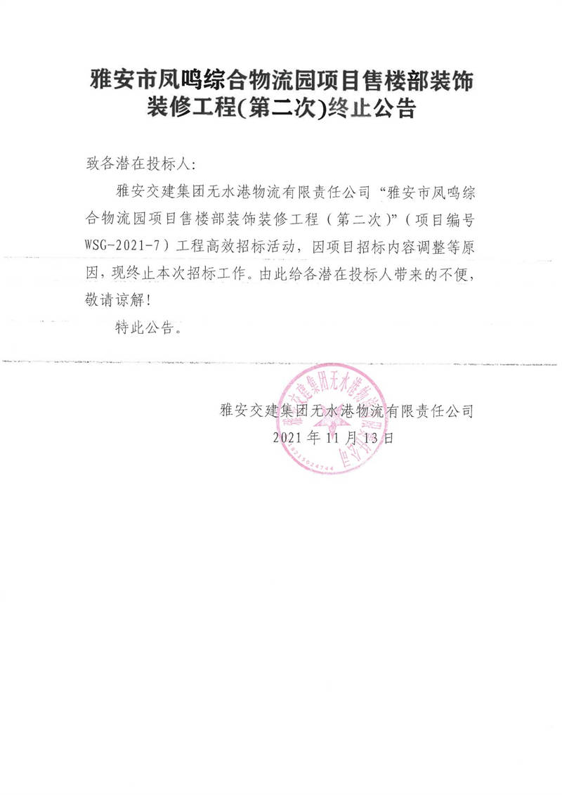 雅安交建集團(tuán)無水港物流有限責(zé)任公司雅安市鳳鳴綜合物流園項(xiàng)目售樓部裝飾裝修工程(第二次)終止公告