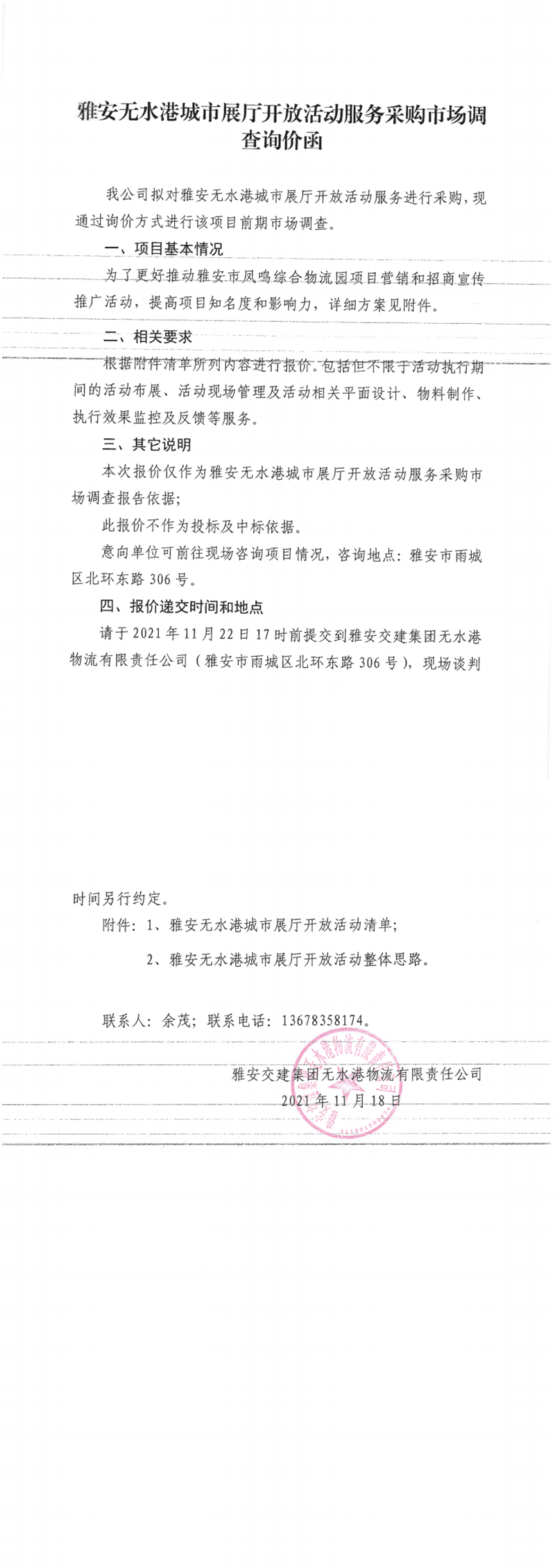 雅安交建集團無水港物流有限責任公司雅安無水港城市展廳開放活動服務采購市場調查詢價函