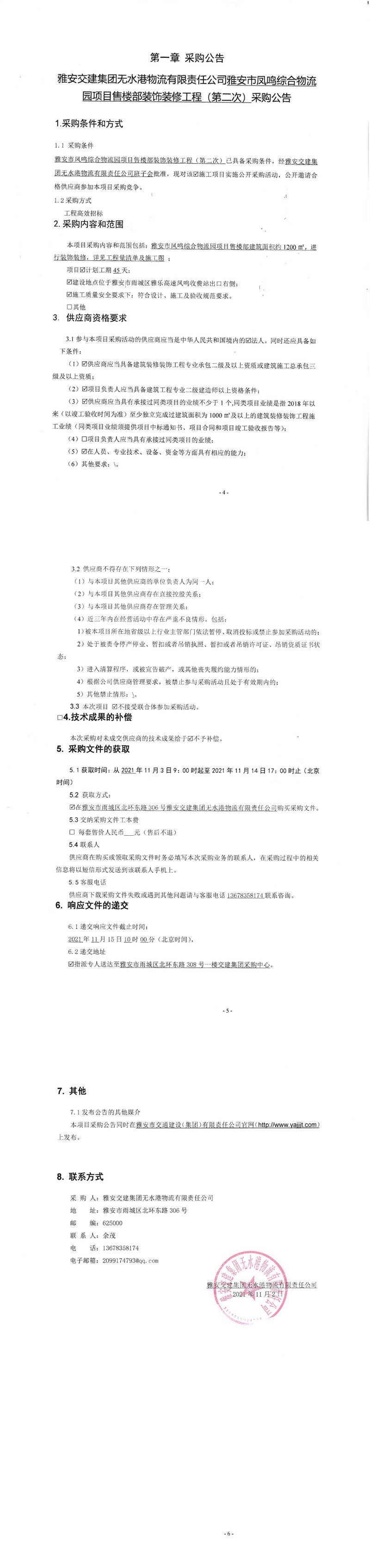 雅安交建集團(tuán)無水港物流有限責(zé)任公司雅安市鳳鳴綜合物流園項(xiàng)目售樓部裝飾裝修工程(第二次)采購公告