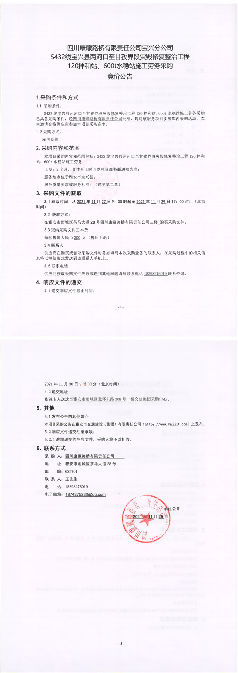 四川康藏路橋有限責(zé)任公司S432線寶興縣兩河口至甘孜界段災(zāi)毀修復(fù)整治工程120拌合站、600t水穩(wěn)站施工勞務(wù)采購競價(jià)公告
