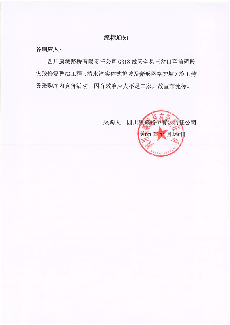 四川康藏路橋有限責任公司G318線天全縣三岔口至前碉段災毀修復整治工程(清水灣實體式護坡及菱形網(wǎng)格護坡)施工勞務采購流標通知