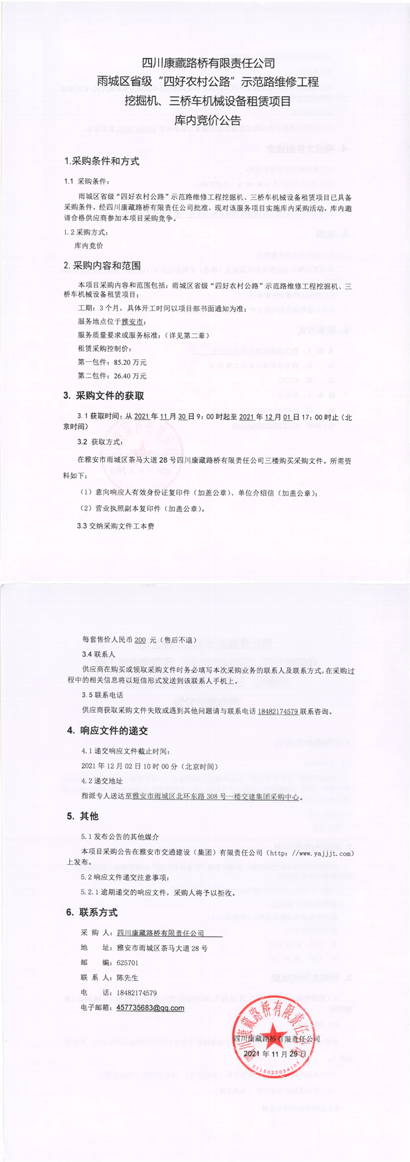 四川康藏路橋有限責(zé)任公司雨城區(qū)省級(jí)“四好農(nóng)村公路”示范路維修工程挖掘機(jī)、三橋車機(jī)械設(shè)備租賃項(xiàng)目庫(kù)內(nèi)競(jìng)價(jià)公告
