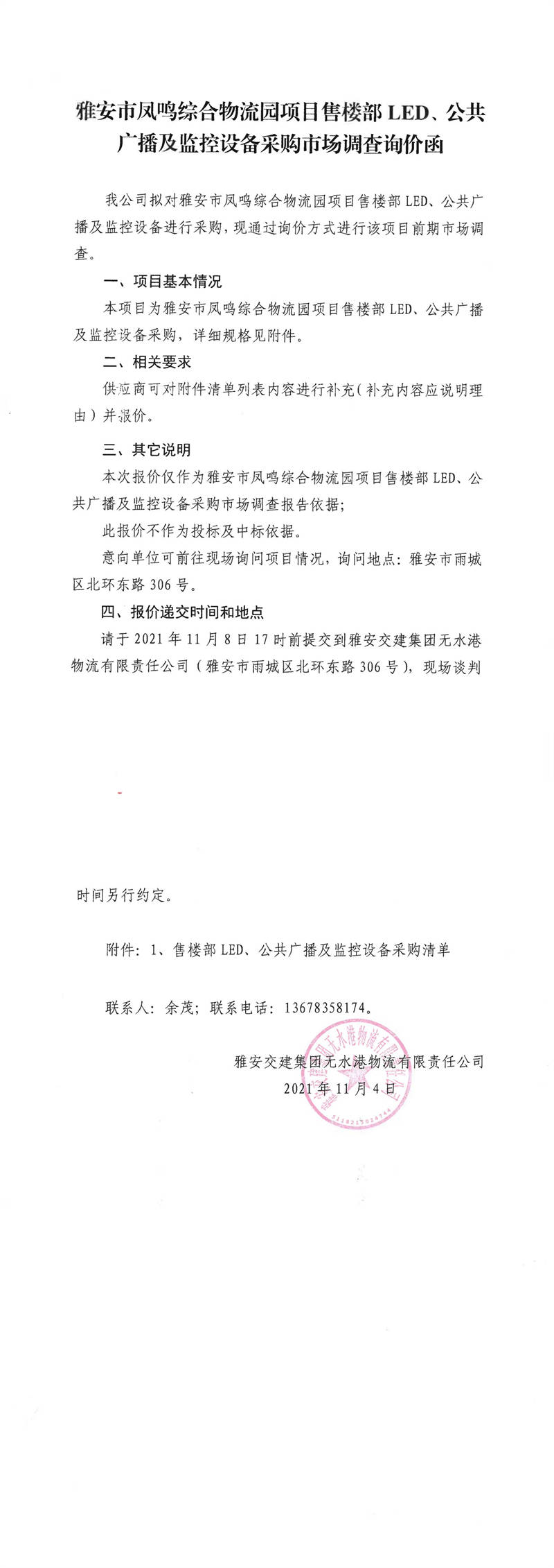 雅安交建集團(tuán)無水港物流有限責(zé)任公司雅安市鳳鳴綜合物流園項(xiàng)目售樓部LED、公共廣播及監(jiān)控設(shè)備采購市場調(diào)查詢價函