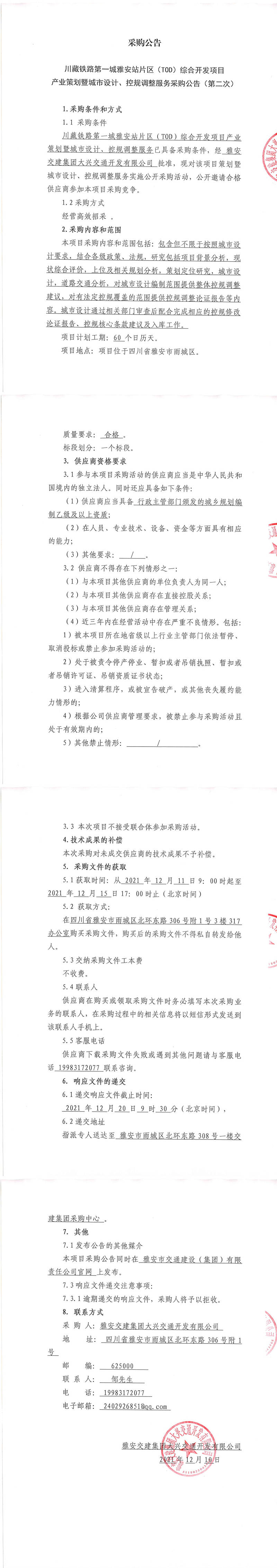 雅安交建集團(tuán)大興交通開(kāi)發(fā)有限公司川藏鐵路第一城雅安站片區(qū)(TOD)綜合開(kāi)發(fā)項(xiàng)目產(chǎn)業(yè)策劃暨城市設(shè)計(jì)、控規(guī)調(diào)整服務(wù)采購(gòu)公告(第二次)