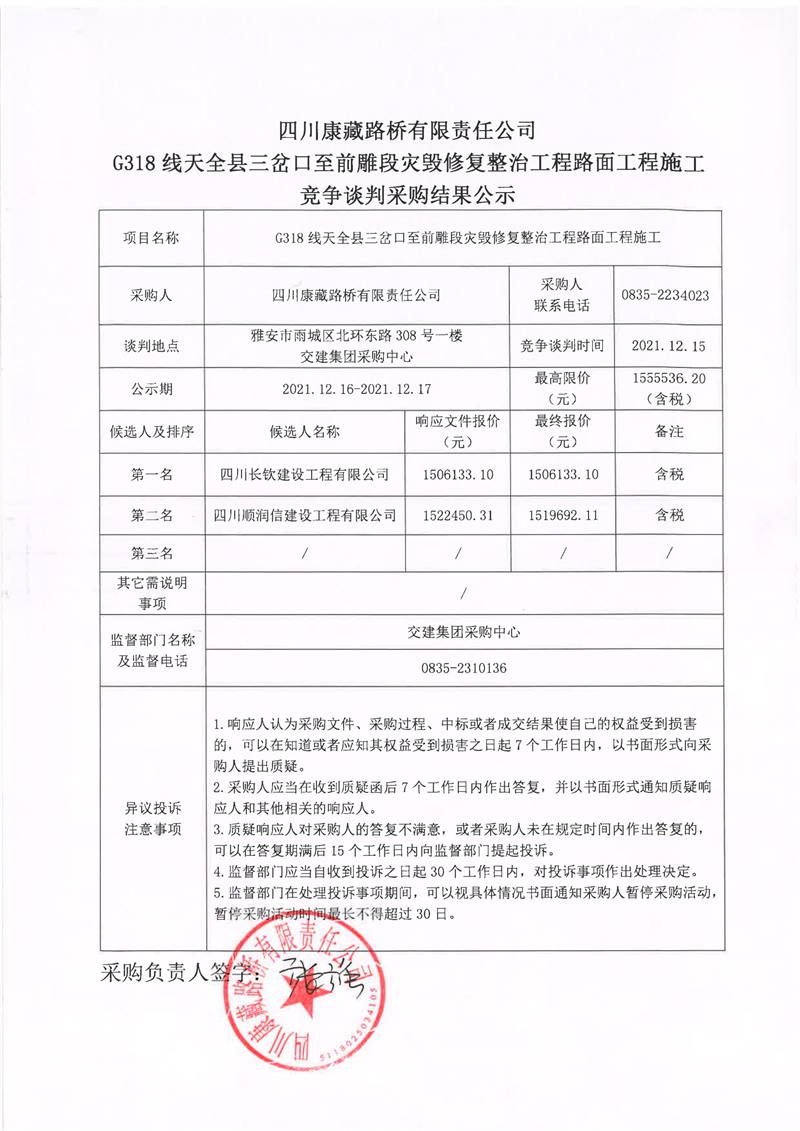 四川康藏路橋有限責(zé)任公司G318線天全縣三岔口至前碉段災(zāi)毀修復(fù)整治工程路面工程施工競(jìng)爭(zhēng)談判采購結(jié)果公示