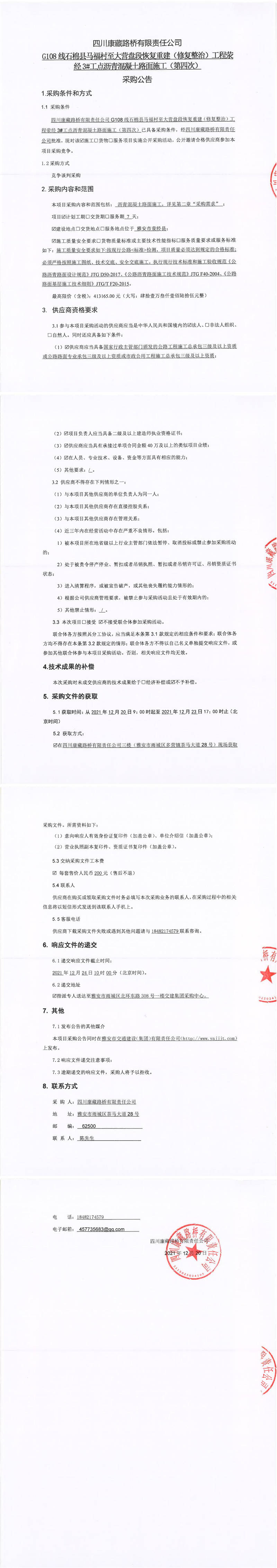 四川康藏路橋有限責(zé)任公司G108線石棉縣馬福村至大營盤段恢復(fù)重建(修復(fù)整治)工程滎經(jīng)3#工點瀝青混凝土路面施工(第四次)采購公告