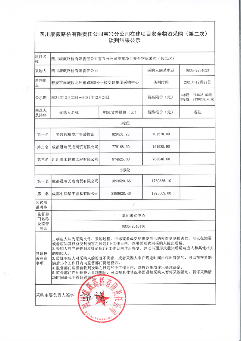 四川康藏路橋有限責(zé)任公司寶興分公司在建項(xiàng)目安全物資采購(第二次)談判結(jié)果公示