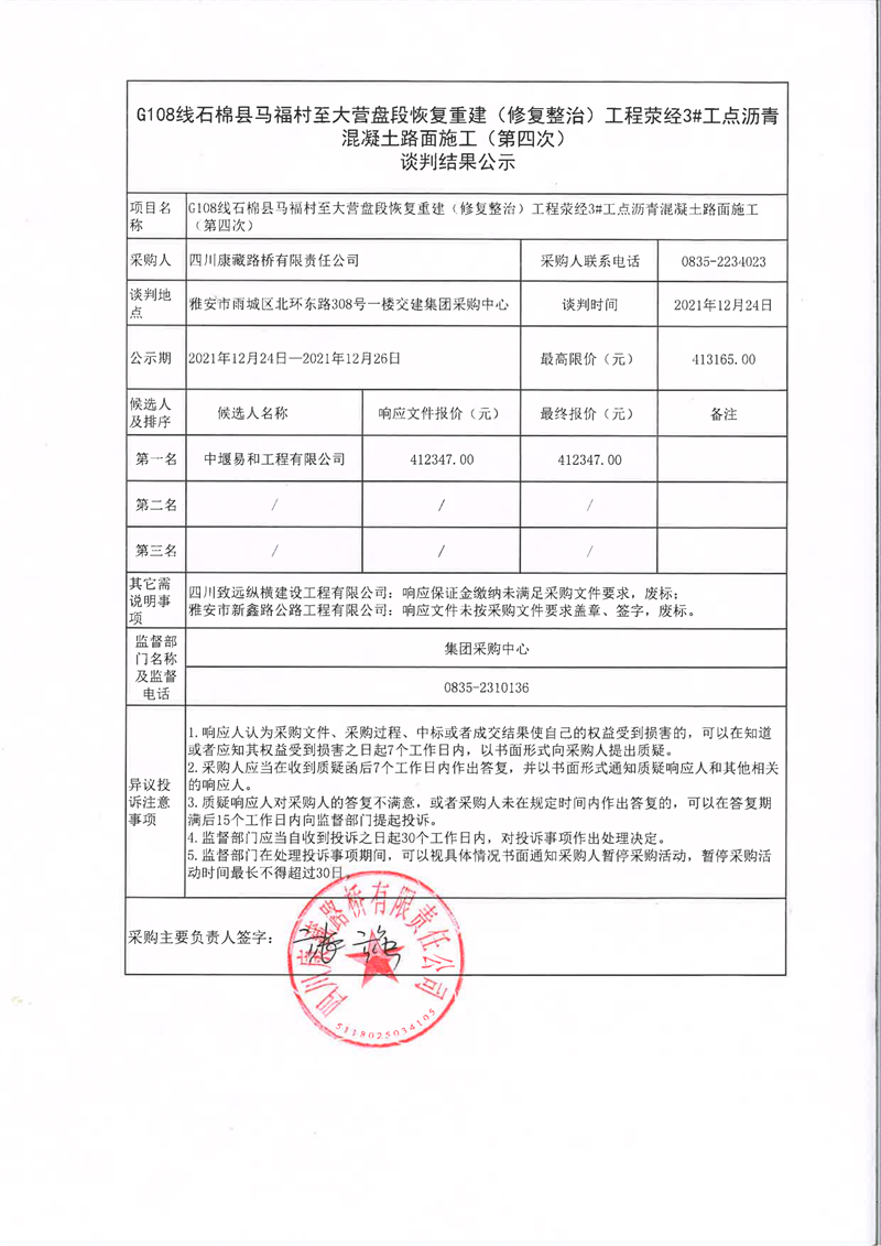 四川康藏路橋有限責任公司G108線石棉縣馬福村至大營盤段恢復重建(修復整治)工程滎經3#工點瀝青混凝土路面施工(第四次)談判結果公示