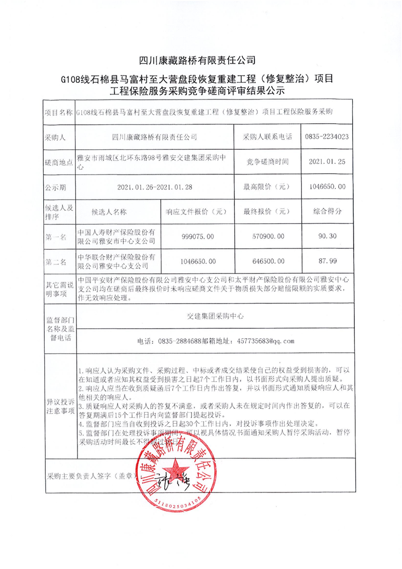 四川康藏路橋有限責(zé)任公司G108線石棉縣馬富村至大營盤段恢復(fù)重建工程(修復(fù)整治)項(xiàng)目工程保險(xiǎn)服務(wù)采購競(jìng)爭(zhēng)磋商評(píng)審結(jié)果公示