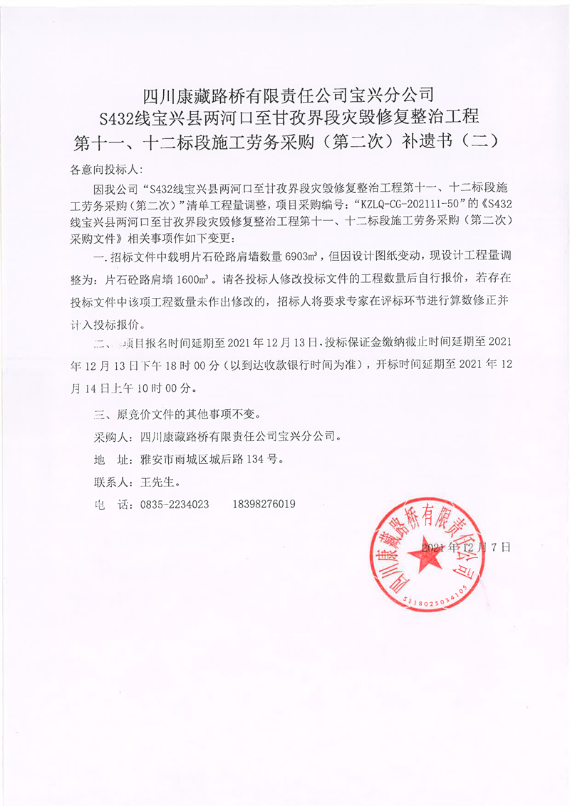 四川康藏路橋有限責(zé)任公司寶興分公司S432線寶興縣兩河口至甘孜界段災(zāi)毀修復(fù)整治工程第十一、十二標(biāo)段施工勞務(wù)采購(gòu)(第二次)補(bǔ)遺書(shū)(二)
