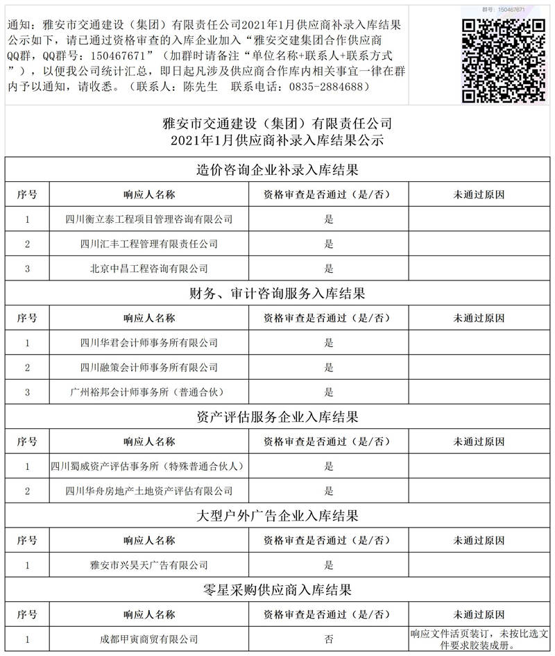 雅安市交通建設(集團)有限責任公司2021年1月供應商補錄入庫結果公示