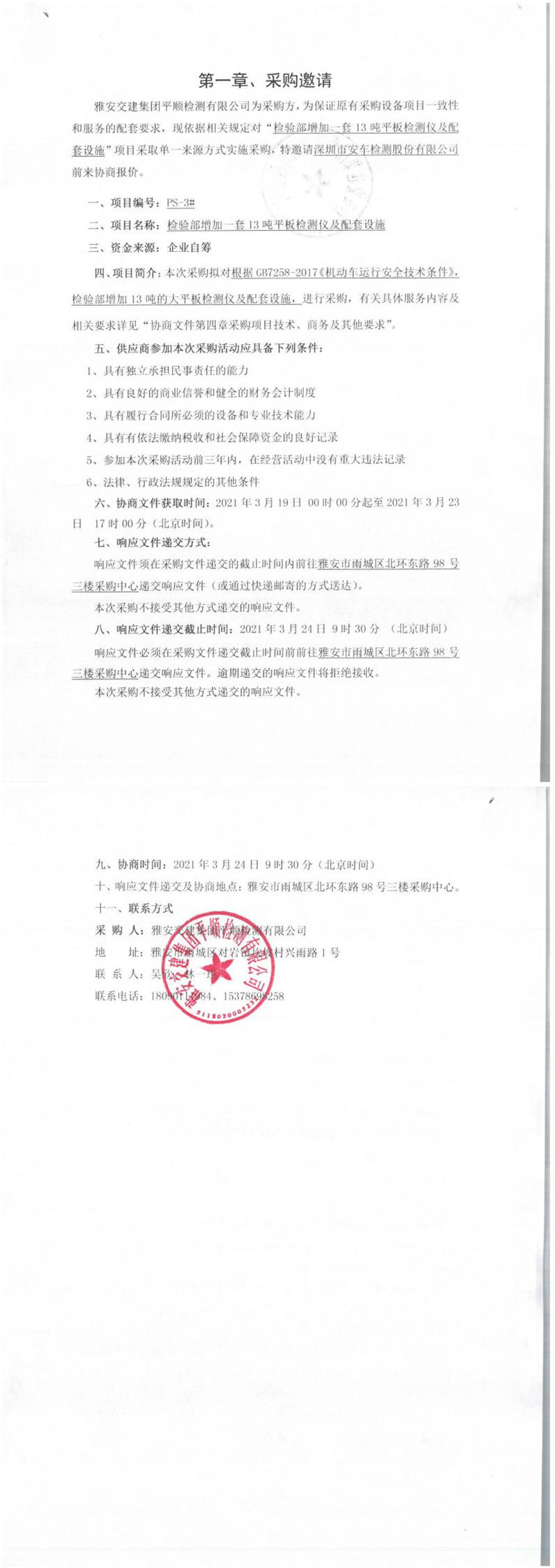 雅安交建集團平順檢測有限公司檢驗部增加一套13噸平板檢測儀及配套設(shè)施單一來源采購邀請