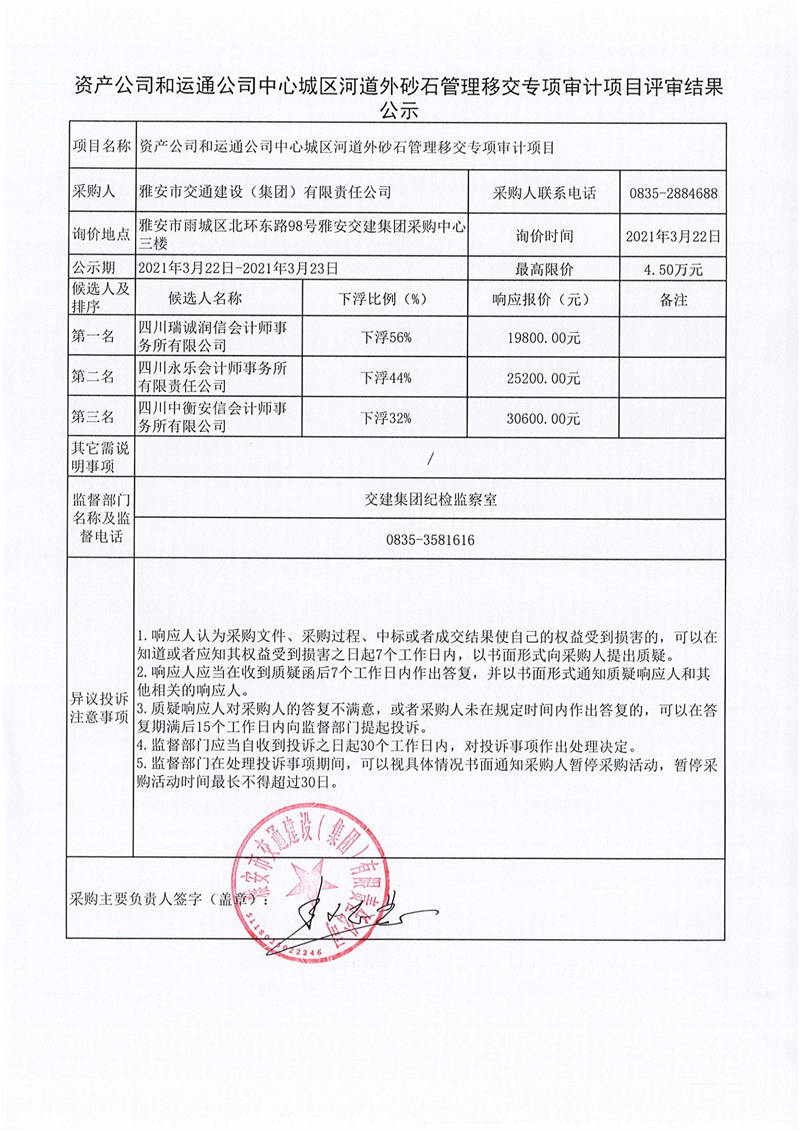 雅安市交通建設(shè)(集團(tuán))有限責(zé)任公司資產(chǎn)公司和運(yùn)通公司中心城區(qū)河道外砂石管理移交專項(xiàng)審計(jì)項(xiàng)目評審結(jié)果公示