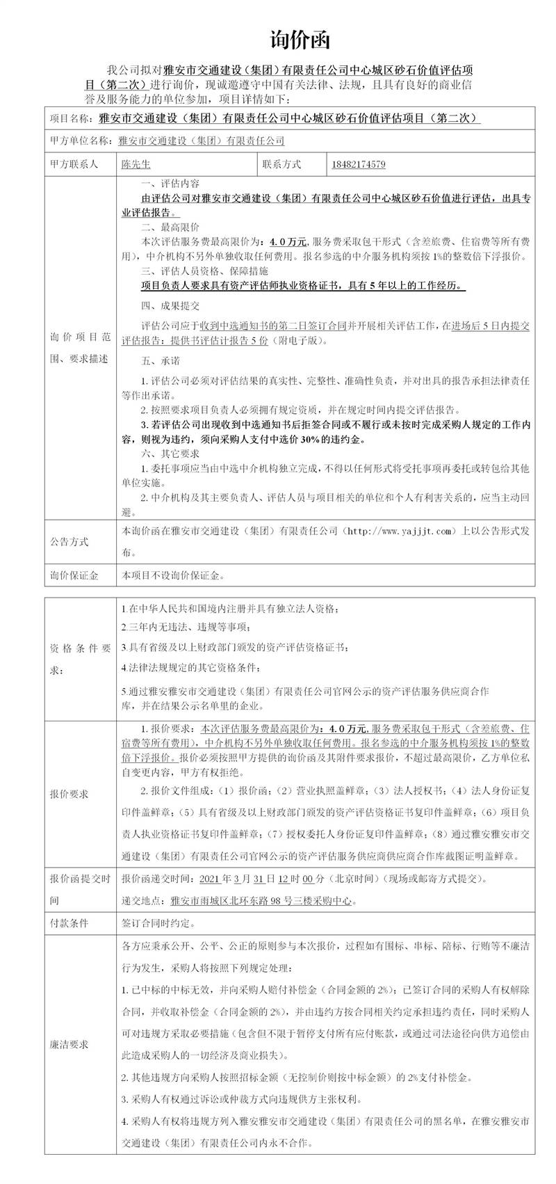 雅安市交通建設(集團)有限責任公司中心城區(qū)砂石價值評估項目(第二次)詢價函
