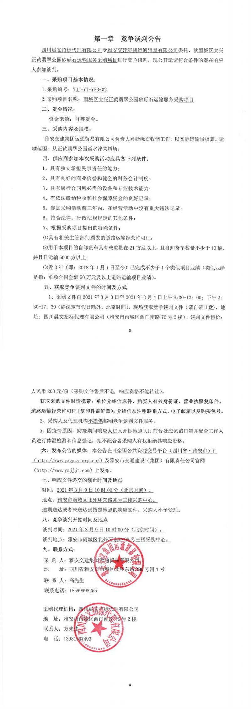 雅安交建集團(tuán)運(yùn)通貿(mào)易有限公司雨城區(qū)大興正黃翡翠公園砂礫石運(yùn)輸服務(wù)采購項(xiàng)目競(jìng)爭(zhēng)談判公告