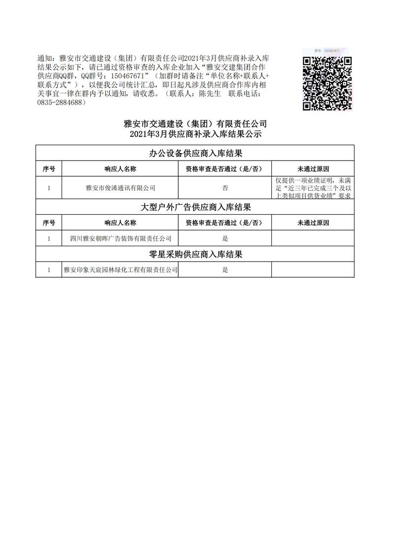 雅安市交通建設(shè)(集團(tuán))有限責(zé)任公司2021年3月供應(yīng)商補錄入庫結(jié)果公示