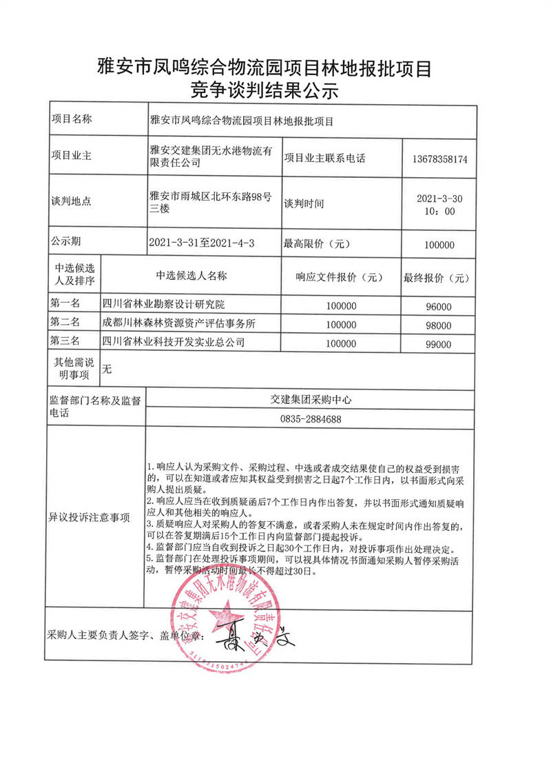 雅安交建集團(tuán)無水港物流有限責(zé)任公司雅安市鳳鳴綜合物流園項(xiàng)目林地報(bào)批項(xiàng)目競爭談判結(jié)果公示
