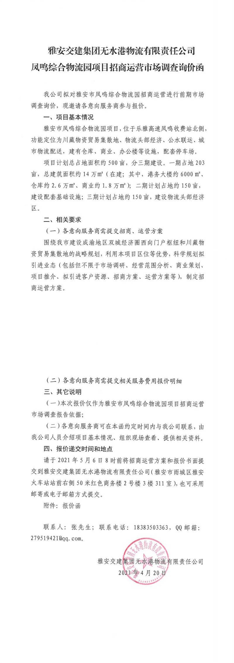 雅安交建集團(tuán)無(wú)水港物流有限責(zé)任公司雅安市鳳鳴綜合物流園項(xiàng)目招商運(yùn)營(yíng)市場(chǎng)調(diào)查詢價(jià)函