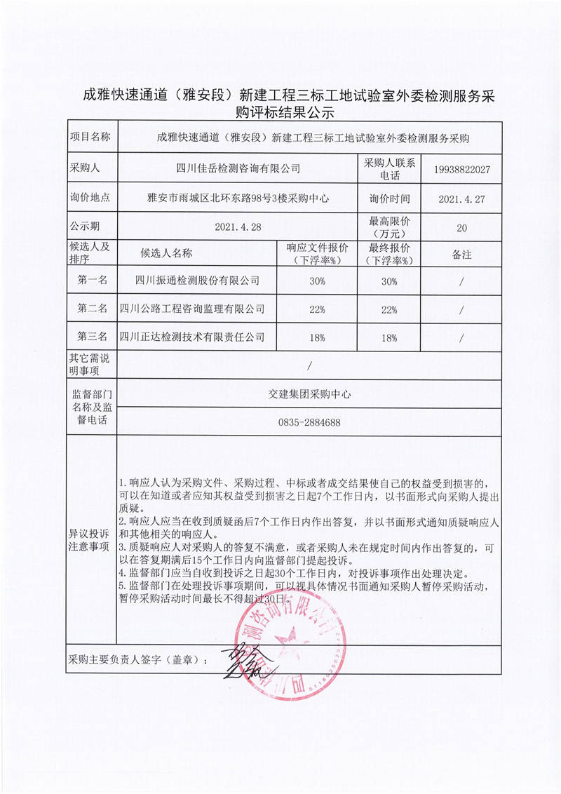 四川佳岳檢測咨詢有限公司成雅快速通道(雅安段)新建工程三標工地試驗室外委檢測服務(wù)采購評標結(jié)果公示