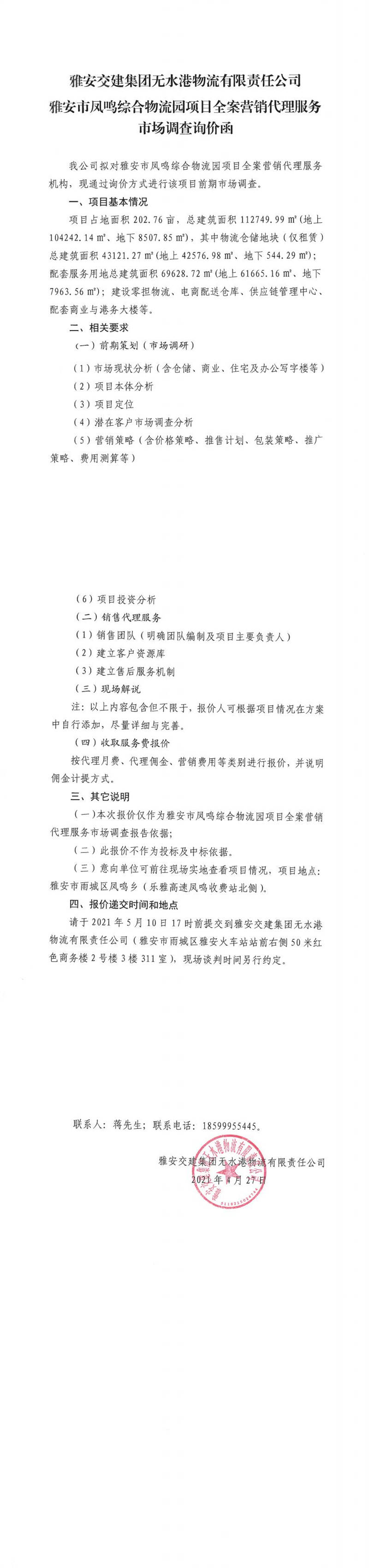 雅安交建集團無水港物流有限責任公司雅安市鳳鳴綜合物流園項目全案營銷代理服務市場調(diào)查詢價函
