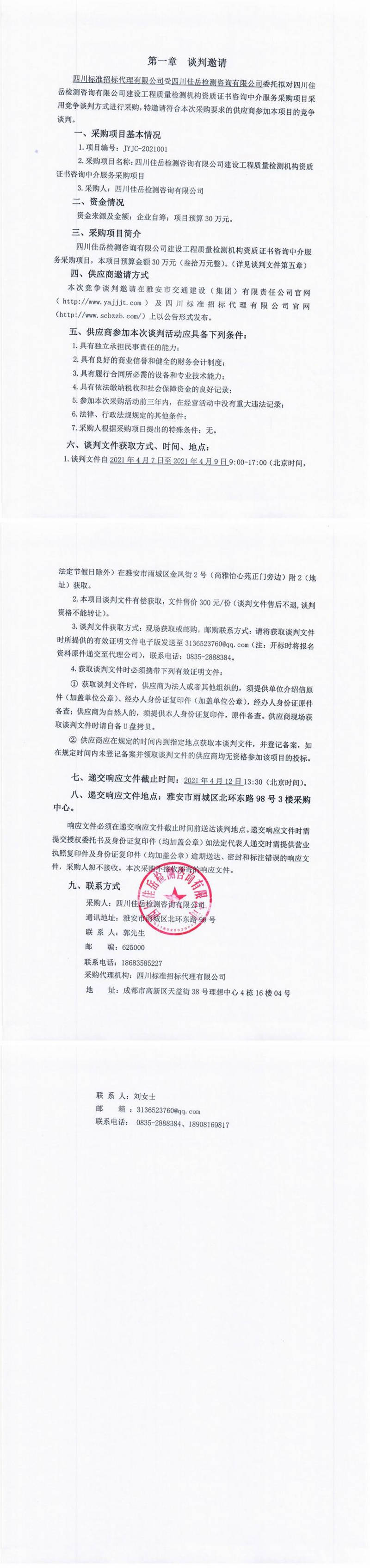 四川佳岳檢測(cè)咨詢有限公司建設(shè)工程質(zhì)量檢測(cè)機(jī)構(gòu)資質(zhì)證書咨詢中介服務(wù)采購(gòu)項(xiàng)目競(jìng)爭(zhēng)談判公告