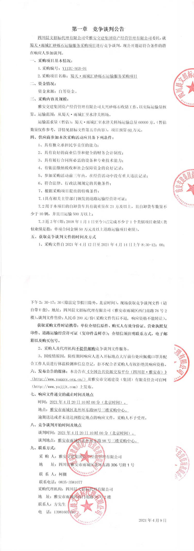 雅安交建集團(tuán)資產(chǎn)經(jīng)營(yíng)管理有限公司蜀天.雨城匯砂礫石運(yùn)輸服務(wù)采購(gòu)項(xiàng)目競(jìng)爭(zhēng)談判公告