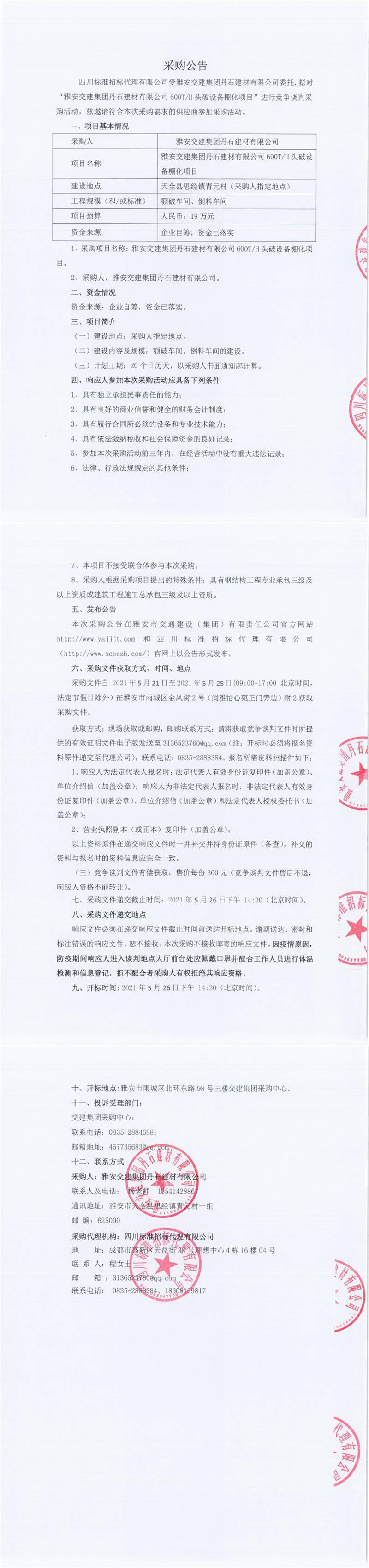 雅安交建集團(tuán)丹石建材有限公司600T/H頭破設(shè)備棚化項(xiàng)目競(jìng)爭(zhēng)談判公告