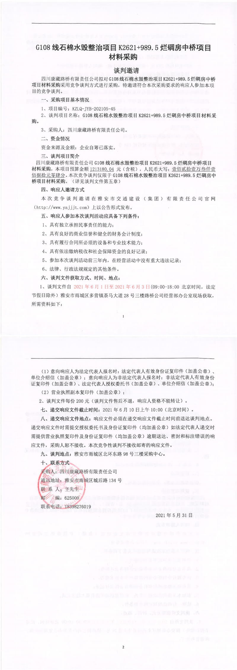 四川康藏路橋有限責(zé)任公司G108線石棉水毀整治項(xiàng)目K2621+989.5爛碉房中橋項(xiàng)目材料采購競爭談判公告